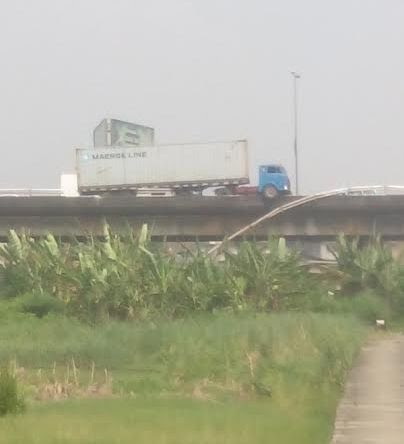 This happened yesterday at the Bridge around Costain in Lagos.Thankfully, it didn't fall over. Photo credit: Osilama10